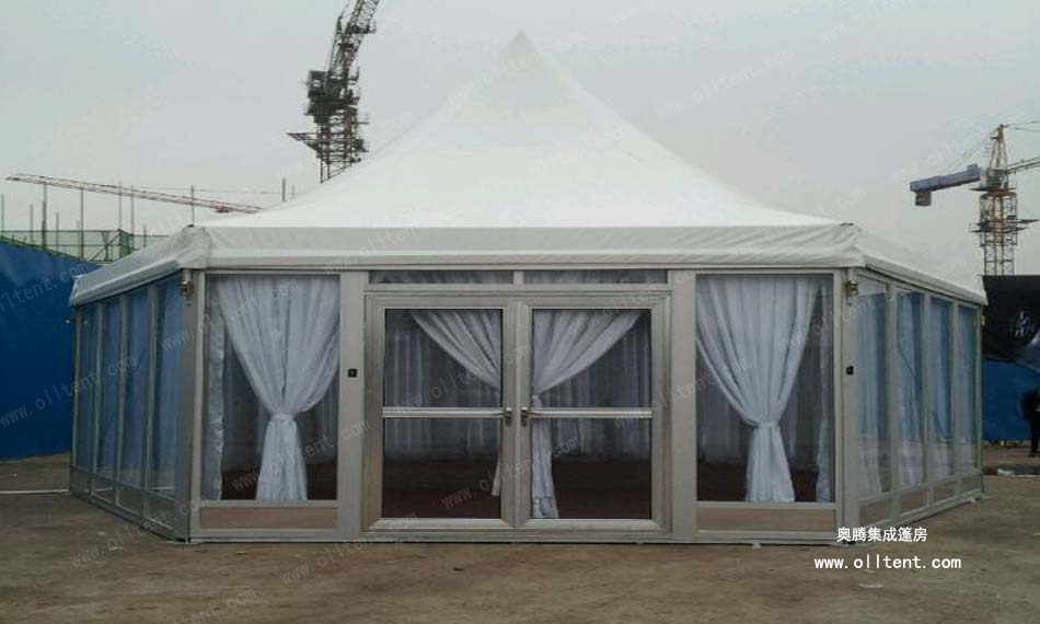 它既有普通篷房在長度方面的靈活性, 又有尖頂和多邊形的特異性,突破了傳統帳篷的單一人字形造型,非常適合各種大型活動,體育賽事, 商業活動,展覽,慶祝等。大跨度的篷房加上尖頂和多邊形的造型,效果驚艷!還可以人字頂和尖頂篷房結合形狀特殊的組合篷房。多邊形篷房特點有:搭建工期短,易于組裝和拆卸。