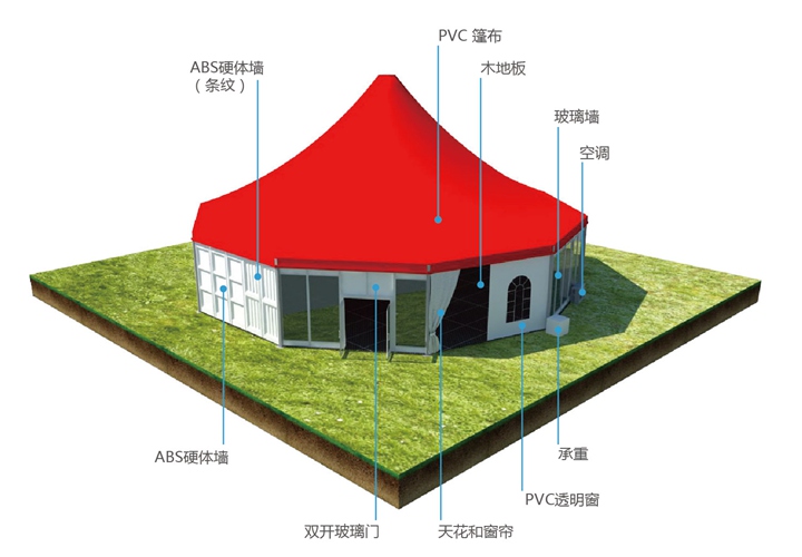 可作為臨時或長期建筑,優雅的多邊形空間,無需額外的內飾。 可靈活地和人字頂篷房結合,組成更獨特的造型。耐用,抗風,并獲得相關證書,可選用全系列配件。
